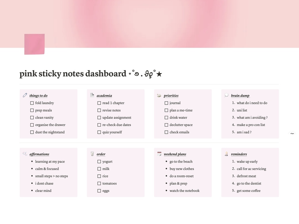 keep your thoughts, tasks, and plans organized with this pink sticky notes dashboard.